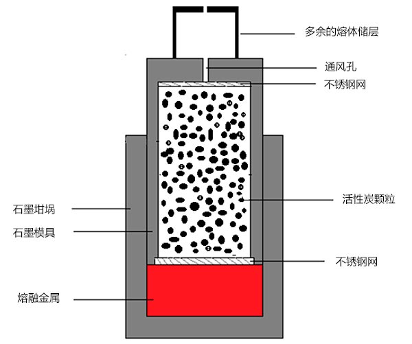 活性炭是性價(jià)比高的碳質(zhì)材料,具有低堆積密度,高比表面積和優(yōu)異的化學(xué)穩(wěn)定性。它廣泛用于水處理,以吸收飲用水中的雜質(zhì)。AZ91鎂合金(9重量%Al,1重量%Zn,0.5重量%Mn,余量Mg)用作金屬復(fù)合泡沫的基質(zhì)。活性炭復(fù)合泡沫材料的制造,首先將石墨模具填充在四個(gè)單獨(dú)的填料和振動(dòng)步驟中,在每個(gè)步驟中使用等量的活性炭顆粒。這種壓實(shí)方法使整個(gè)樣品高度的密度梯度最小化。在該步驟之后,將不銹鋼網(wǎng)插入模具的開口端以將活性炭顆粒保持在適當(dāng)位置。組裝在充滿氬氣的手套箱內(nèi)進(jìn)行,以最小化系統(tǒng)中的氧氣水平。為此,將AZ91合金塊插入石墨坩堝內(nèi),并將填充的石墨模具倒置在坩堝內(nèi)。然后將鋼帽放在模具頂部以在滲透鑄造期間收集過量的熔體。在下一步中,這些部件位于不銹鋼套管內(nèi)。最后,將組件放入電爐內(nèi)并在660℃的溫度下保持45分鐘,同時(shí)使用保護(hù)性氬氣氛以防止鎂合金在鑄造過程中氧化燃燒。通過施加0.02MPa的壓力迫使金屬熔體滲入填充的活性炭顆粒床。在大氣條件下冷卻模具后,手動(dòng)從模具中取出生產(chǎn)的樣品。圖1顯示了使用的設(shè)置的示意圖。