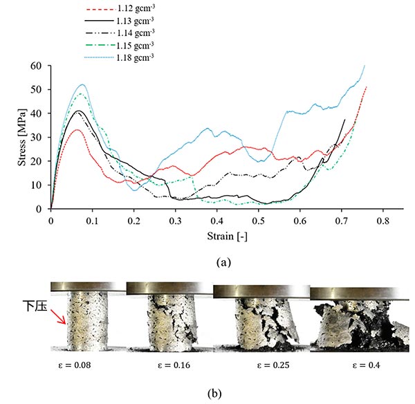 圖4.(a)具有不同密度的活性炭復(fù)合泡沫材料的壓縮應(yīng)力-應(yīng)變曲線,和(b)密度為1.15g/cm-3的活性炭復(fù)合泡沫材料的宏觀變形。